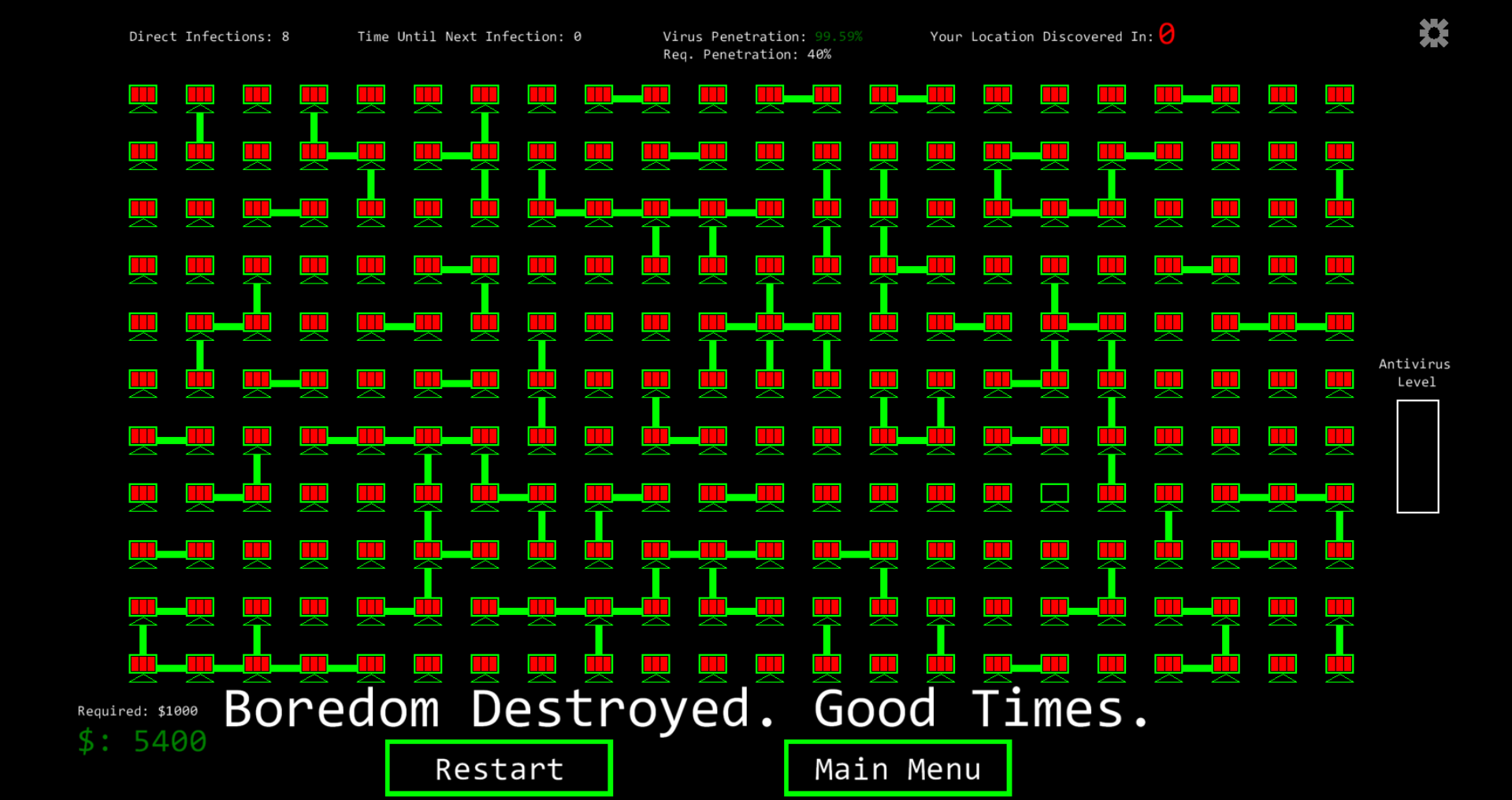 Thanks so much for playing! I'm glad you enjoyed it. I do agree with you about the anti-virus spike being a bit OP depending on how many connections exist, but I also liked that it added for so many permutations of levels where some versions of them are easier/harder based on the rng of it as you said.